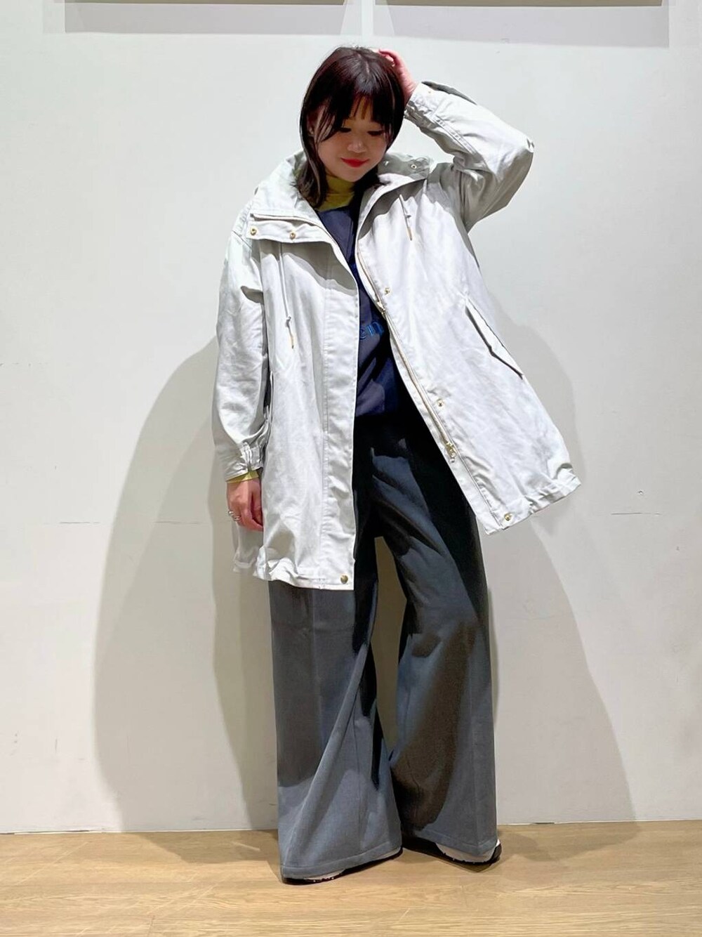 🌼.* Aラインシルエットで裾はドロストコード入りで フロントは逆開ファスナー開きで、 上下で開け閉めできるおすすめアイテムです✨ 袖口はゴム入りでスピンドルをひいて ギャザーができるデザインもポイントです❤️