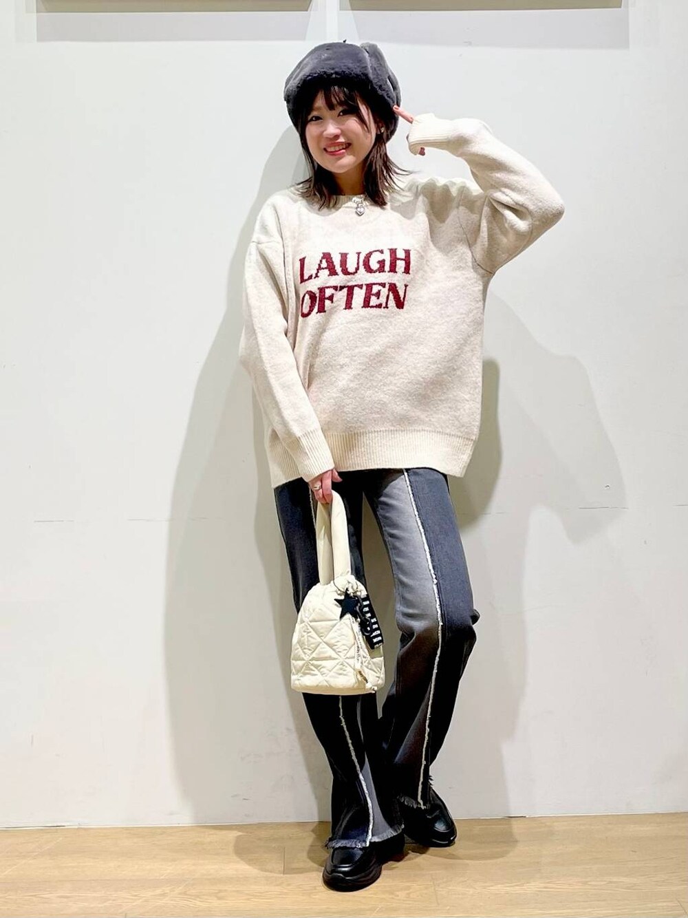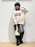 🌼 トップスはカジュアルになり過ぎないロゴや フォントの位置がポイントですっ♡♡ アイボリーのニットには赤ロゴですが、 ニット自体にも赤の繊維が少し混じっていてて 可愛くなっております🧶✨ 定番デニムで合わせても とっても可愛いですよ❤️