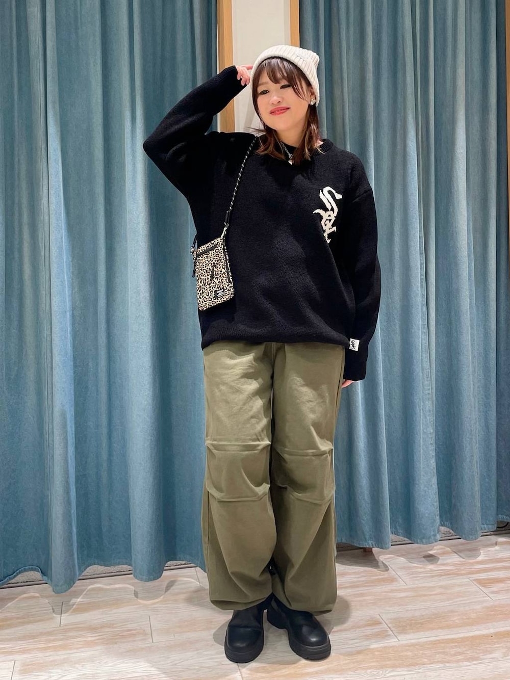 メンズライクコーデ🌵❤️ ◾︎MLBチームロゴHAPPYニット MLBのチームロゴニットプルオーバー🖤 各チームのロゴデザインを ジャガードで表現した1枚になってます✨ ポップでカジュアルなアイテムなので ユニセックスで着用可能です🌼‼️ ◾︎カツラギパラシュートパンツ 膝のタックで立体的なドレープ感と 膝の曲げやすさを兼ね備えたデザインです💕