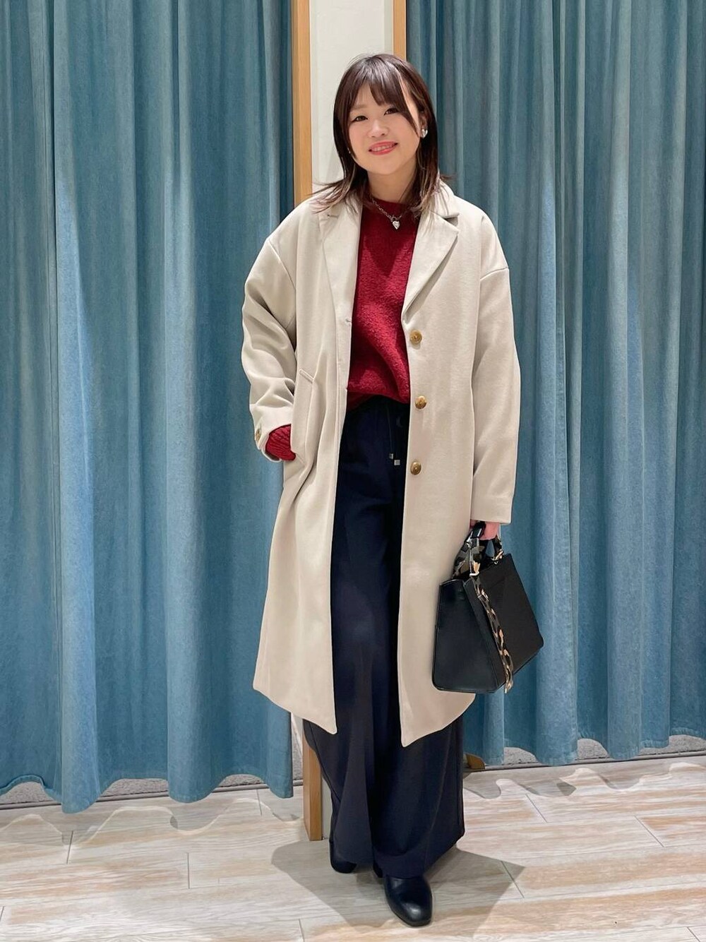 大人キレイめコーデ⸜🌷︎⸝ アウターは自社開発素材の 定番ウーリーテック素材なんです🫶🏽❤️🔥 ウール見えしてウールより軽くて暖かいなんて 最高じゃないですか🔥 お手に取りやすい価格帯なのもポイント💡´- 裏地つきで暖かく サイズも2サイズ展開なので お好きな丈感で選んで頂けますよ🌼