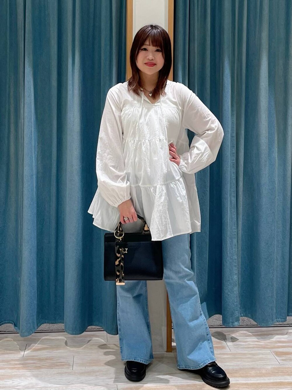 akari(BAYFLOW モレラ岐阜)のハンドバッグ「[多ポケットで便利]レオパードテープフェイクレザートート」を使ったコーディネート