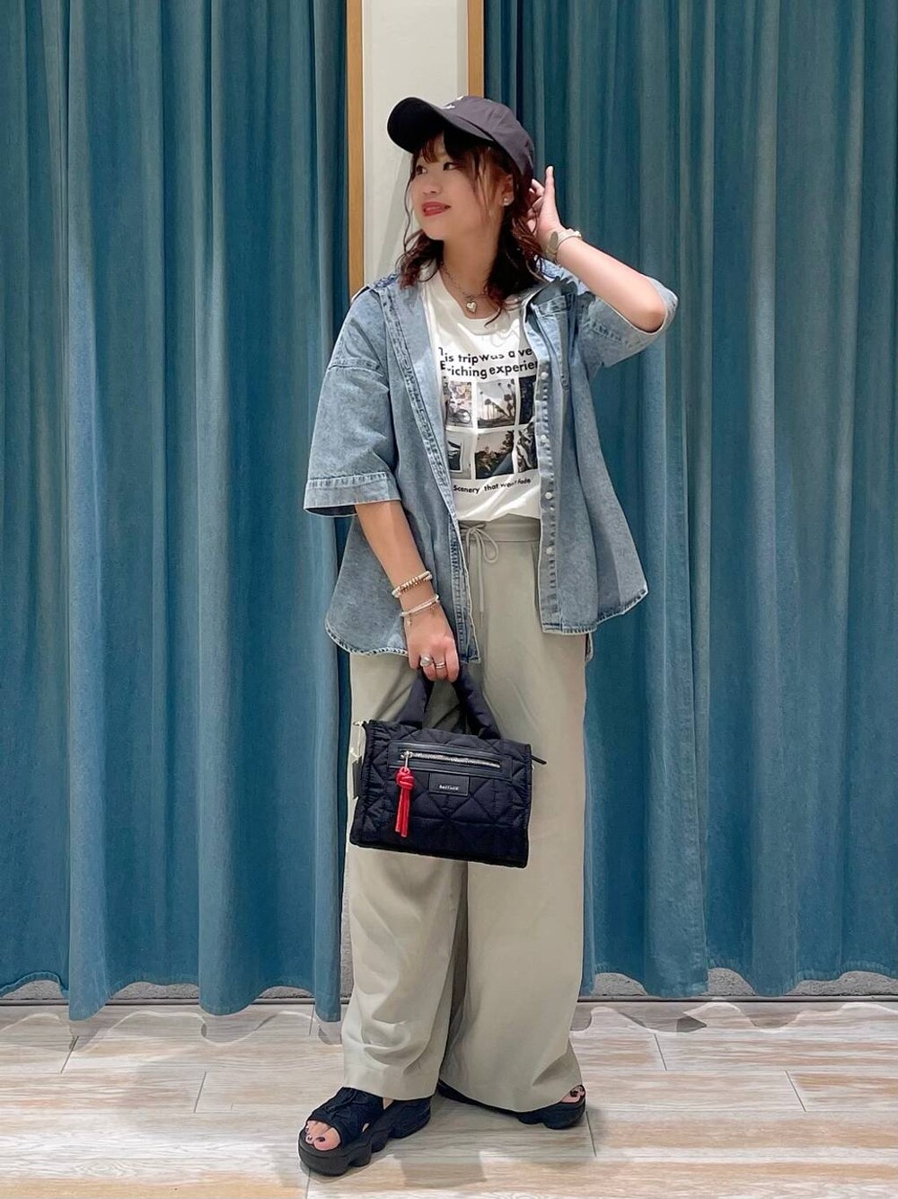 キレイめにはけるワイドパンツでも デニムシャツ羽織れば カジュアル感も増します🩷 シャツを脱いでもTシャツ1枚でも オシャレみえするフォトTは子供っぽくならないので オススメです💫