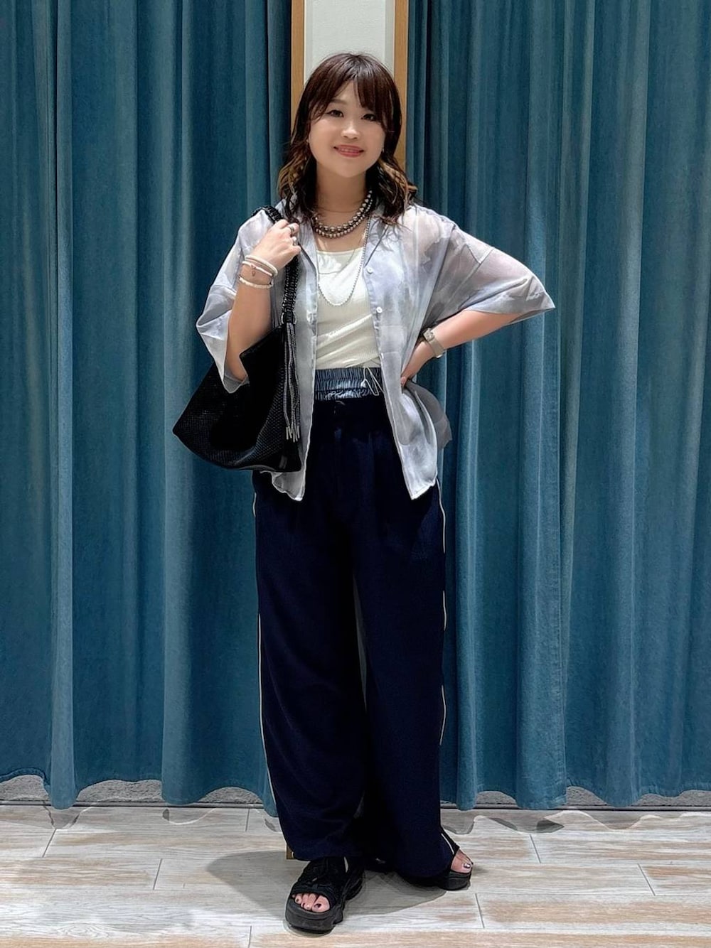 akari(BAYFLOW モレラ岐阜)のキャミソール「【bijorie】カップ付きバッククロスキャミ/NEW BASIC 25SS」を使ったコーディネート