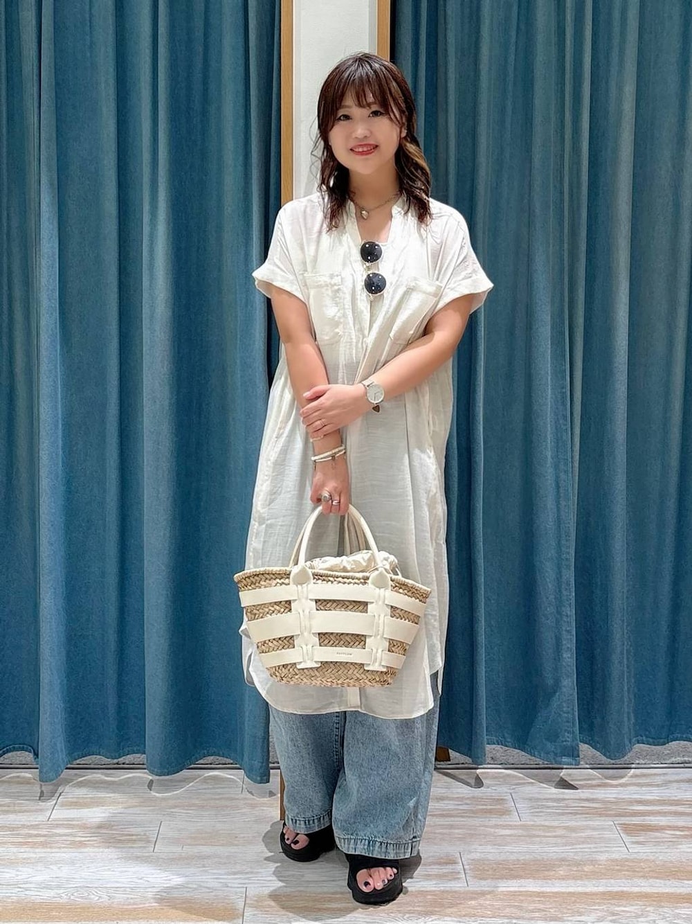 二の腕カバーもしてくれるのに スッキリ見えなシャツワンピース✨ ホワイトで明るさもだしつつ 夏っぽいコーデです🌼