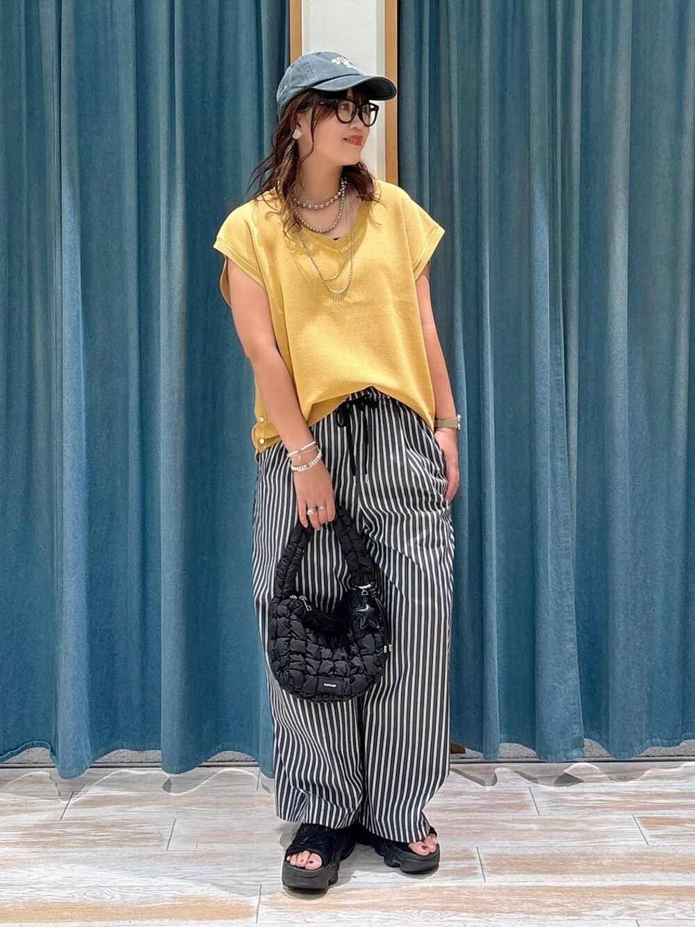 カジュアルコーデ🐝♡♡ パンツはタイプライターのような ハリ感のある素材を使用👍🏽 風通しの良いワイドなデザインで、 真夏も快適に着用可能です✨