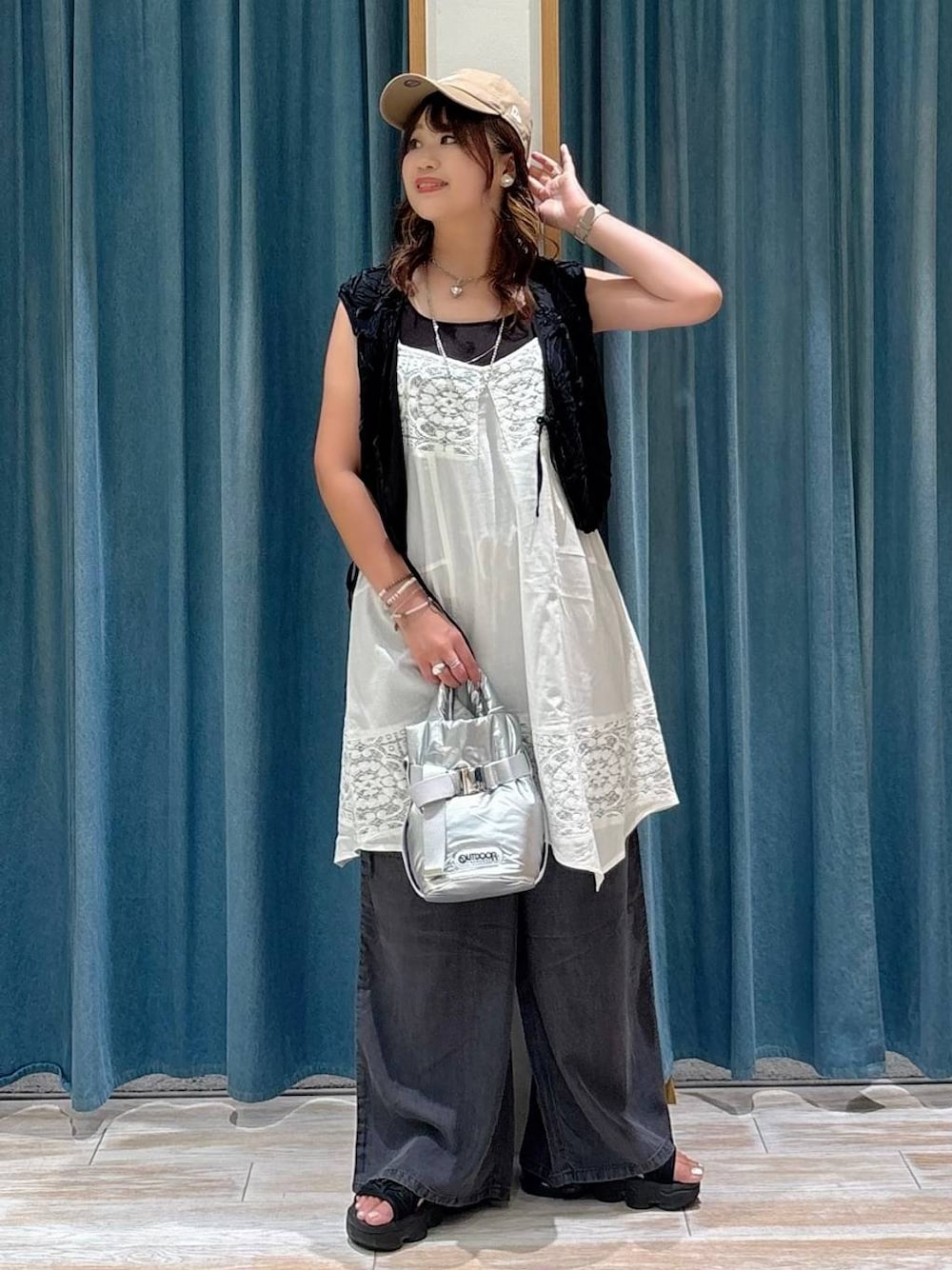 akari(BAYFLOW モレラ岐阜)のキャミソール「【bijorie】カップ付きバッククロスキャミ/NEW BASIC 25SS」を使ったコーディネート