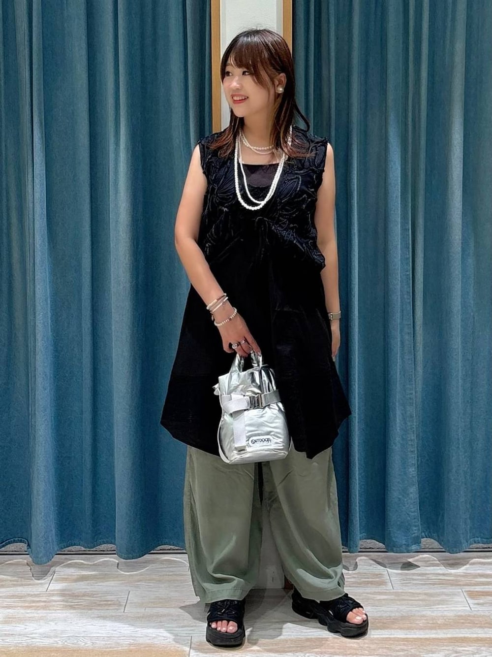 akari(BAYFLOW モレラ岐阜)のキャミソール「【bijorie】カップ付きバッククロスキャミ/NEW BASIC 25SS」を使ったコーディネート