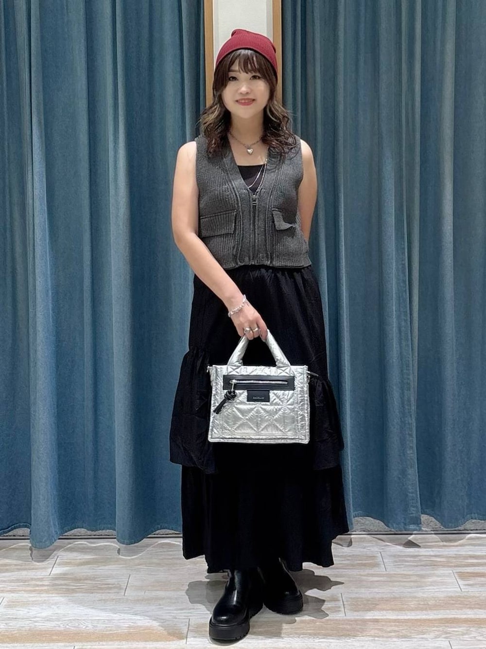 フリルスカートはフェミニンになりやすいですが 小物でハードな感じをだすと カッコよくきまります!