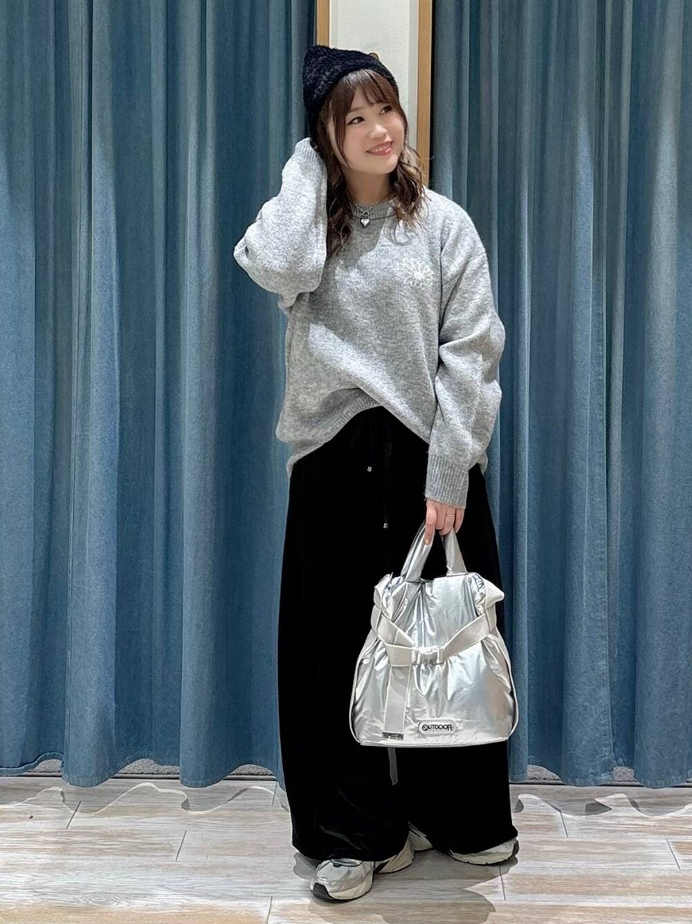モノトーンコーデ🪩 グレーとブラックのシンプルな時は 小物をシルバーで煌やかに✨ ニットもモチモチとして あたたかさもあるので 今の時期はアウターなしでも着用できます!