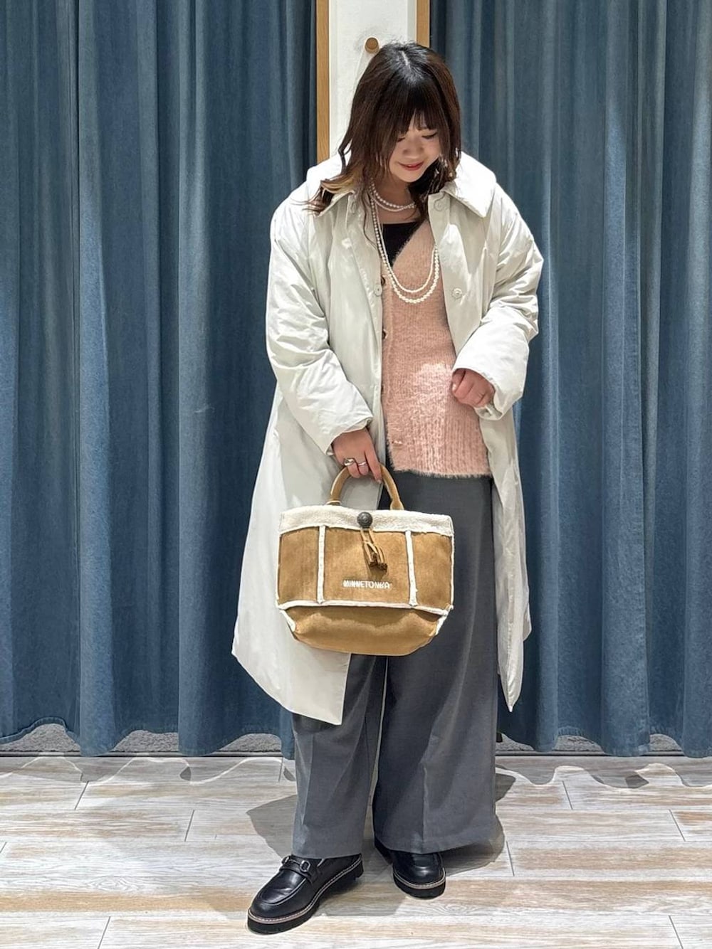 撥水機能付きのロングダウンコート🌼 ロングの着丈で気になるヒップまわりを カバーしつつ、 前を締めれば防寒対策もバッチリです🥂