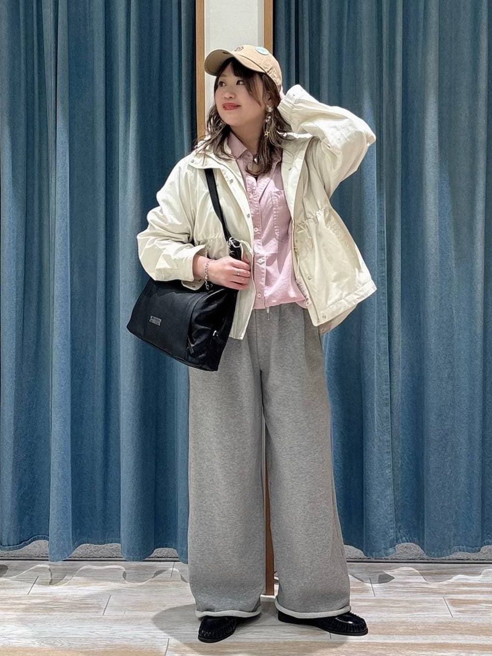 春らしい軽やかなマウンテンパーカーに、 ピンクシャツでやわらかさをプラス🌸 ラフなスウェットパンツも、 キャップと小物で大人カジュアルにまとめました◎