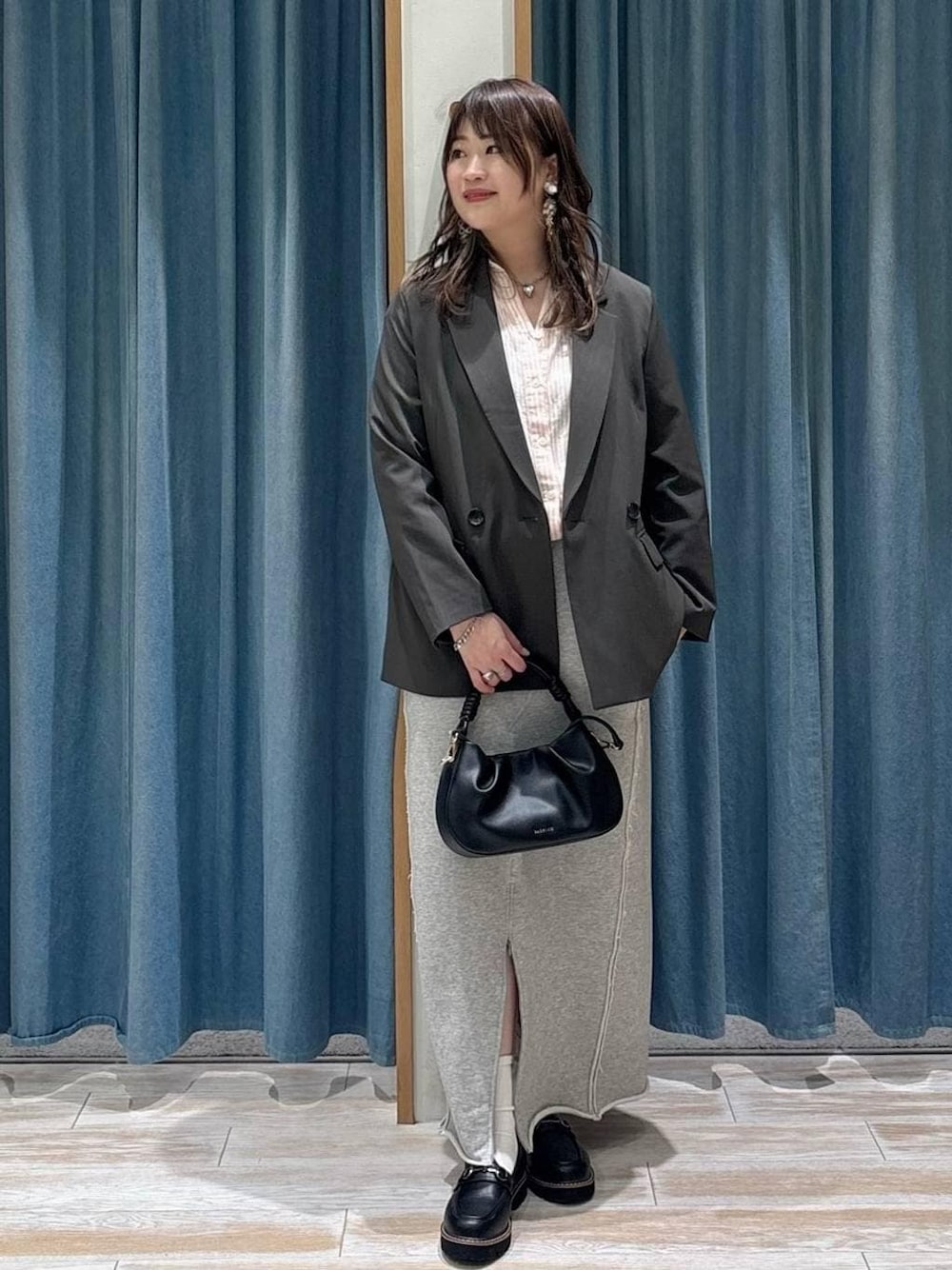 ジャケット羽織ってカジュアルダウン💖 スカートは スウェットなのでウエスト楽ちん✨ フロントジップの調節もして頂けます🌈