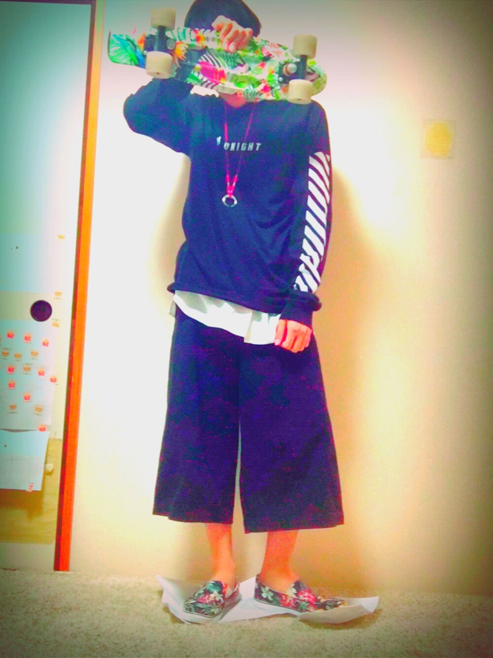 WEGOばっか!笑 このスケボーは乗るだけに使ってるやつだけど、かっこつけて技やったら骨折しました!😎 靴とスケボー柄合わせてる✌