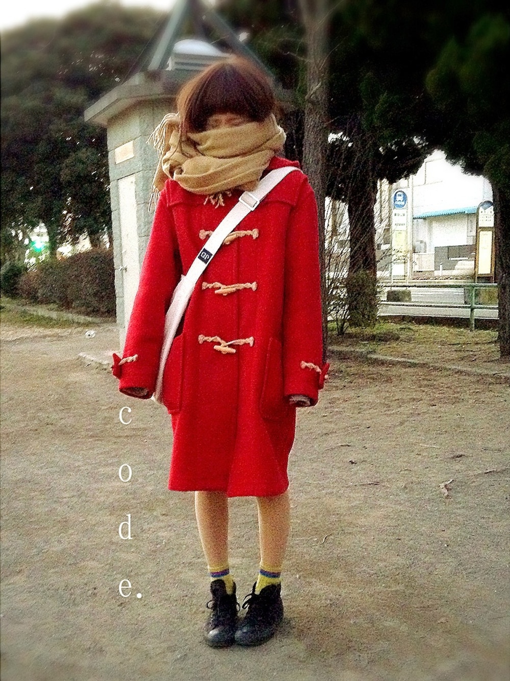 お久しぶりです ▽ ダッフル : I am I(used) ▼ かばん : B-shop ▽ マフラー : 古着 ▼ 靴下 : 靴下屋 ▽ 靴 : コンバース