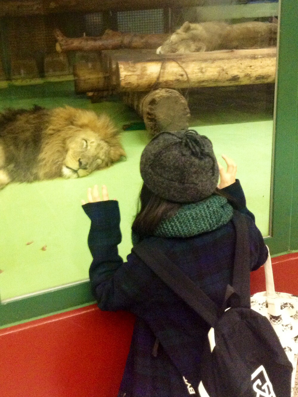 ライオンとのスリーしょっと!寝姿ねこみたい! 後ろ姿が子供みたいになってしまった。 ネコトートも連れてったよ!動物園にねこちゃんもいたらいいのにね! コートもスヌードもみどり系でまとめてみた 帽子がお気に入りなんです!