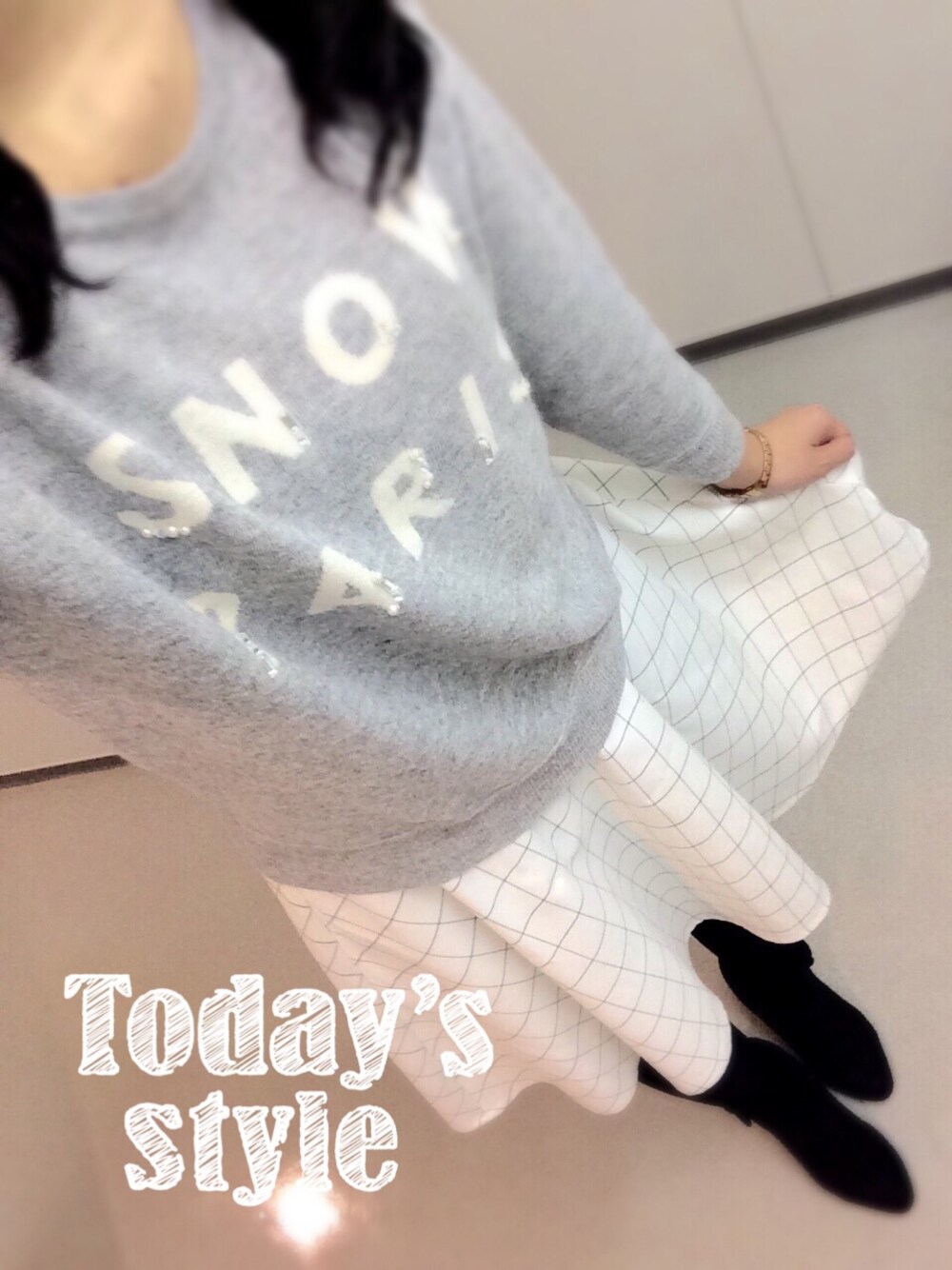 休日出勤コーデ(´°ω°`) ロゴニット可愛いけど 普通の日は 会社に着ていけないから この機会に着てきました♪ ロゴにビジューがついてて カジュアル過ぎず 上品な感じのニットなので スカートもシンプルに 白のウィンドウペン柄で♡ 最近ちょっとずつ 寒さが和らいできてる気がするので このニットも着納めかな〜 生地は薄手なんだけど ロゴが「SNOW」だから さすがに春は着れない(~_~;)