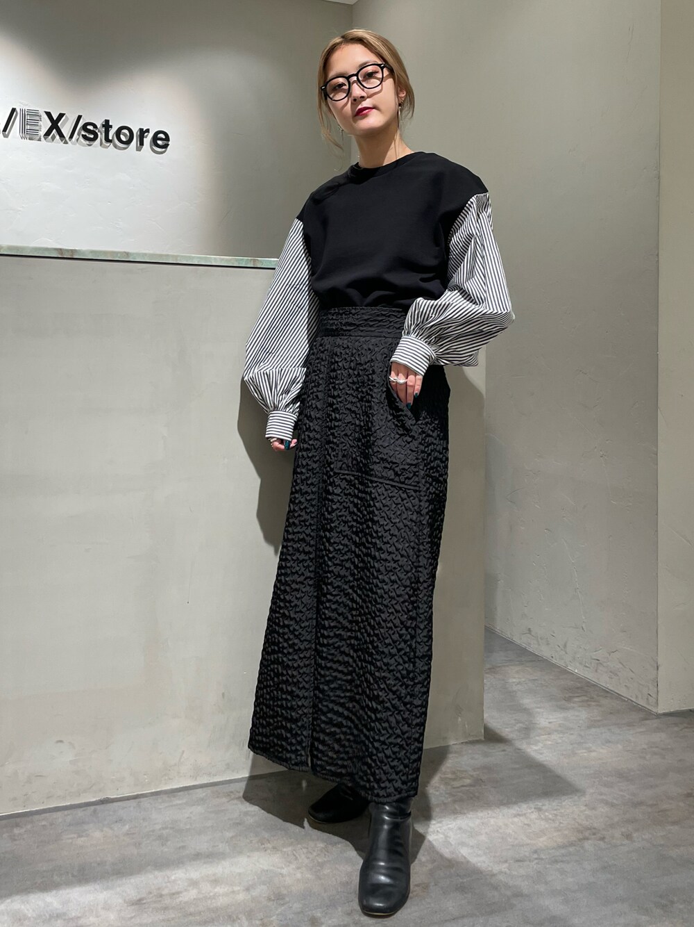 yuka nakamori(Lui's/EX/store なんばCITY店)のTシャツ/カットソー「裏毛ストライプ切替ボリュームスリーブトップス」を使ったコーディネート