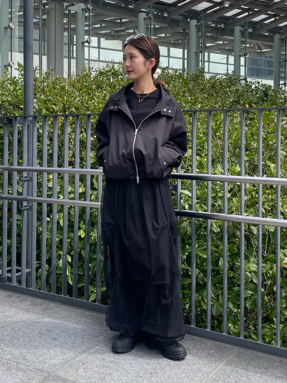 ショート丈のブルゾンにチュールスカートを合わせたトレンドコーデ❕