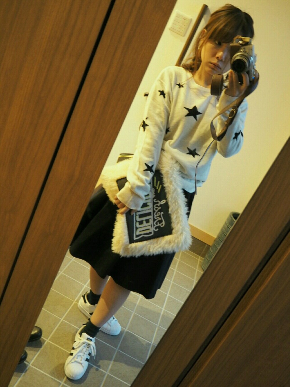 すごい顔してんな(笑) 先日の服装… テーマは白黒!ZOZOTOWNのハイパーセールで★のセーター購入しました~★だいすきです(^^) キャセリーニにクラッチは田中里奈ちゃんが持っていて気になっていてセールだったので購入しちゃいました~♥もこもこで可愛い!!