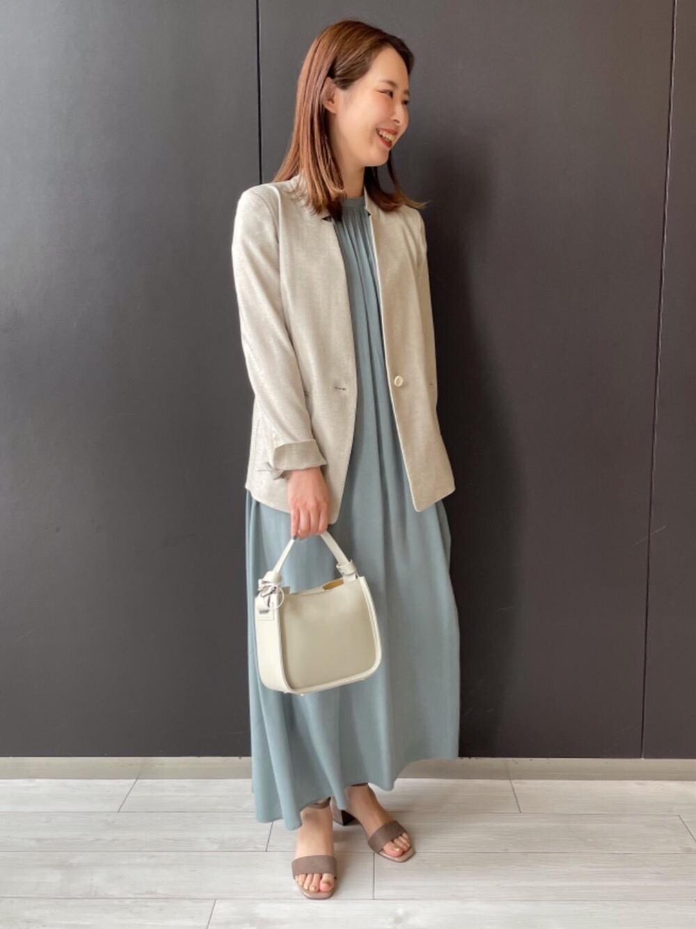 【身長:160cm】 くすみカラーが可愛いワンピースは、丈感が長く1枚でこなれ感がでます◎羽織りをジャケットにすることでカチッとした印象にしています!