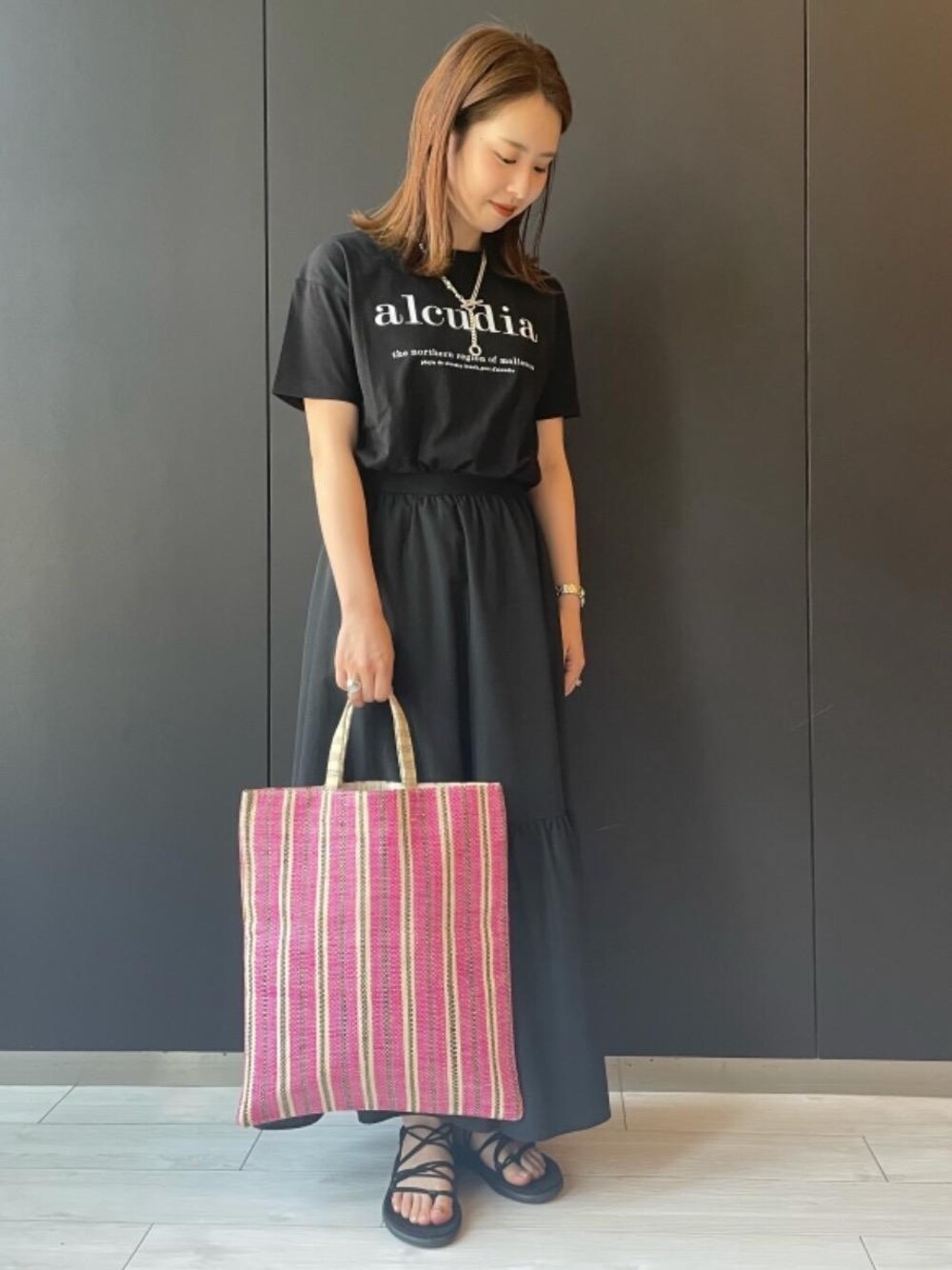 【身長:160cm】 全体をブラックでまとめ、アクセントに夏らしいピンクのバックを合わせました◎