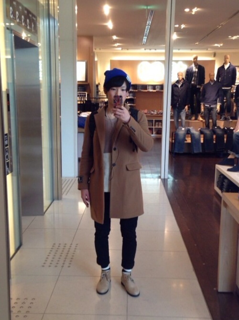 ベージュワントーンしたかったけどパンツいいのなくて黒入れて差し色で青ニット。 メメントのリュックお気に入りです