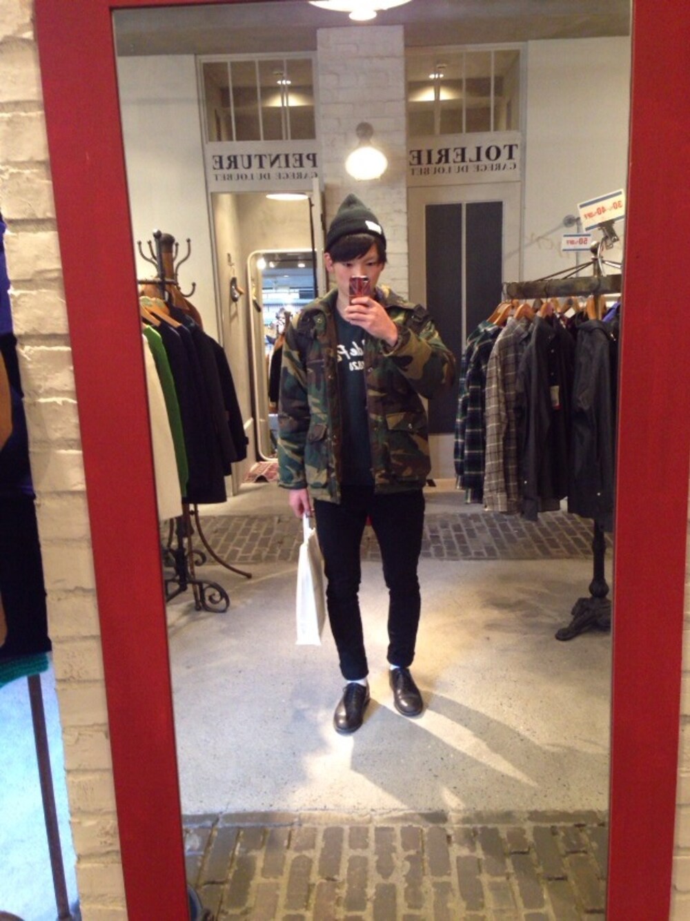 カモ柄ブルゾンに同色系ニット。 見にくいけど紺ジャケットも着てるんです笑 Vライン激アツっすよね! アウターは古着。