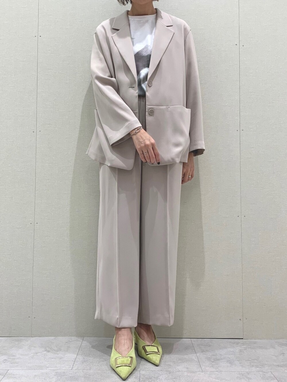 シンプルなさらっとしたジャケットとパンツでスーツっぽく。 インナーにフォトプリントTシャツではずし、脚元にイエローパンプスを持ってきて春っぽく。