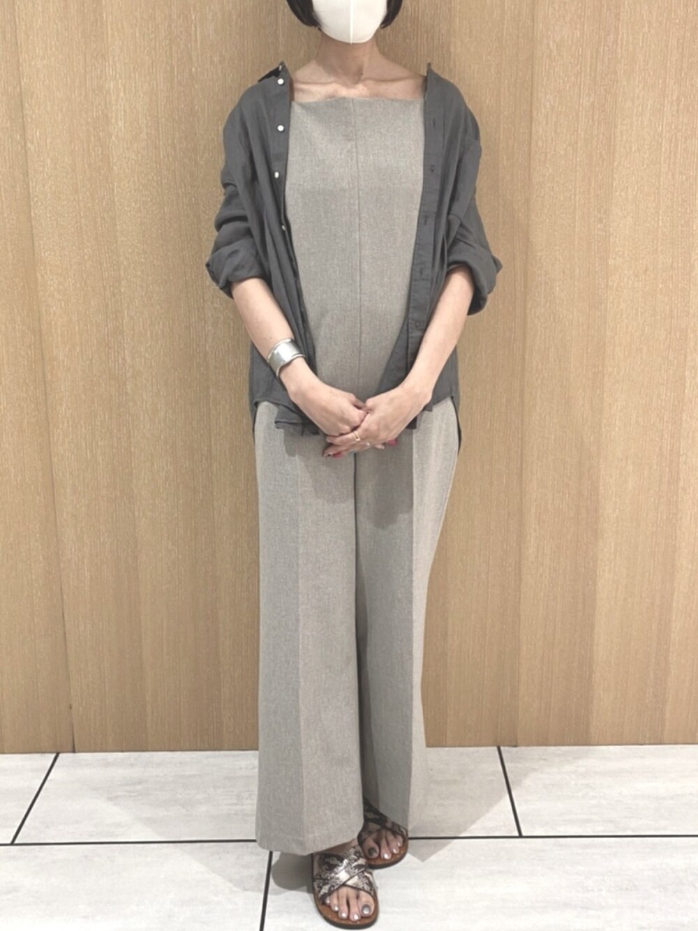 初夏のワントーンコーデ。 お家ウェアにもなるオールインワンに、リネンシャツをサラッと羽織ってお出かけ風にアレンジ。 脚元はパイソンでシンプルコーデに華を。