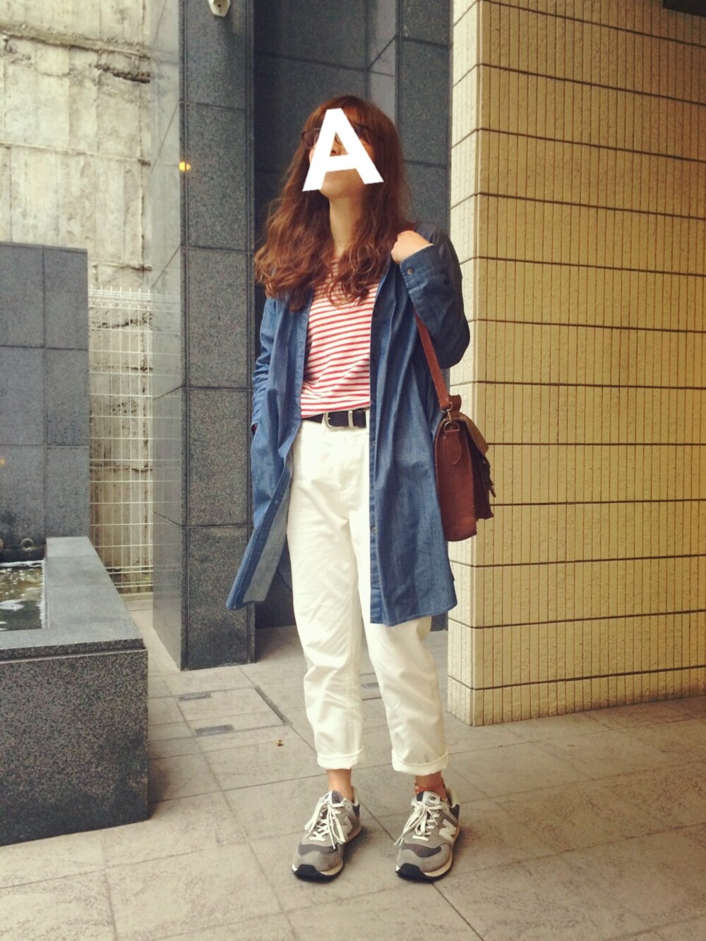 春らしく白パンのコーデにしました☻ 赤ボーダーのカットソーにブルーのデニムシャツで明るめカラーです。 外出が気持ちいい季節ですね〜( ^ω^ )