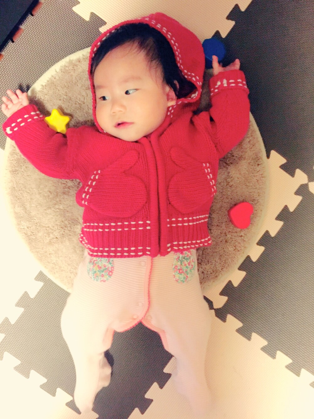 今日は寒かったから足付きロンパースで楽ちんに‼︎ニットのパーカーはポッケがお気に入り♡