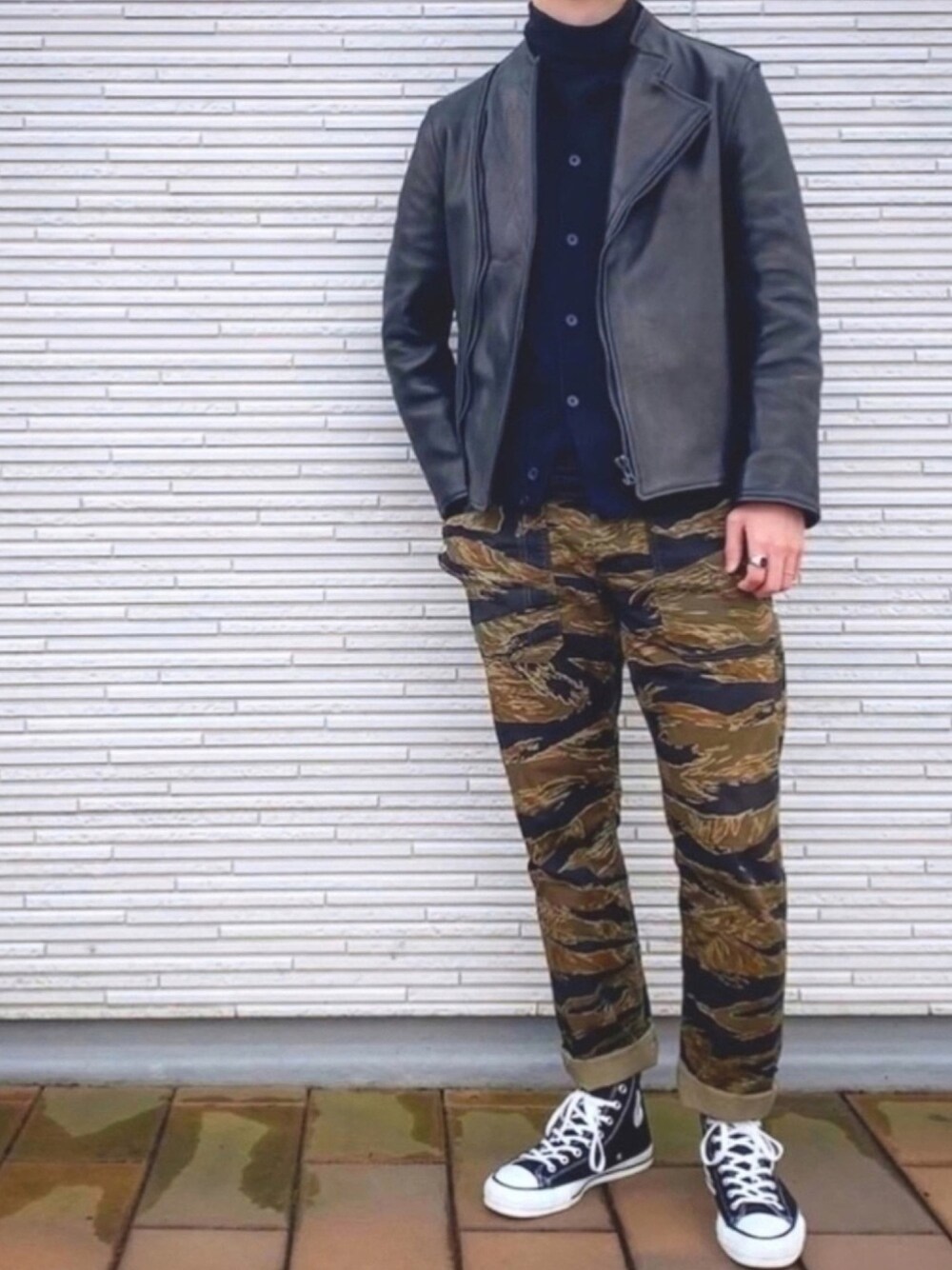 leather×tigercamouflage レザージャケット:3 タートルネック:L カーディガン:L パンツ:M スニーカー:27.5