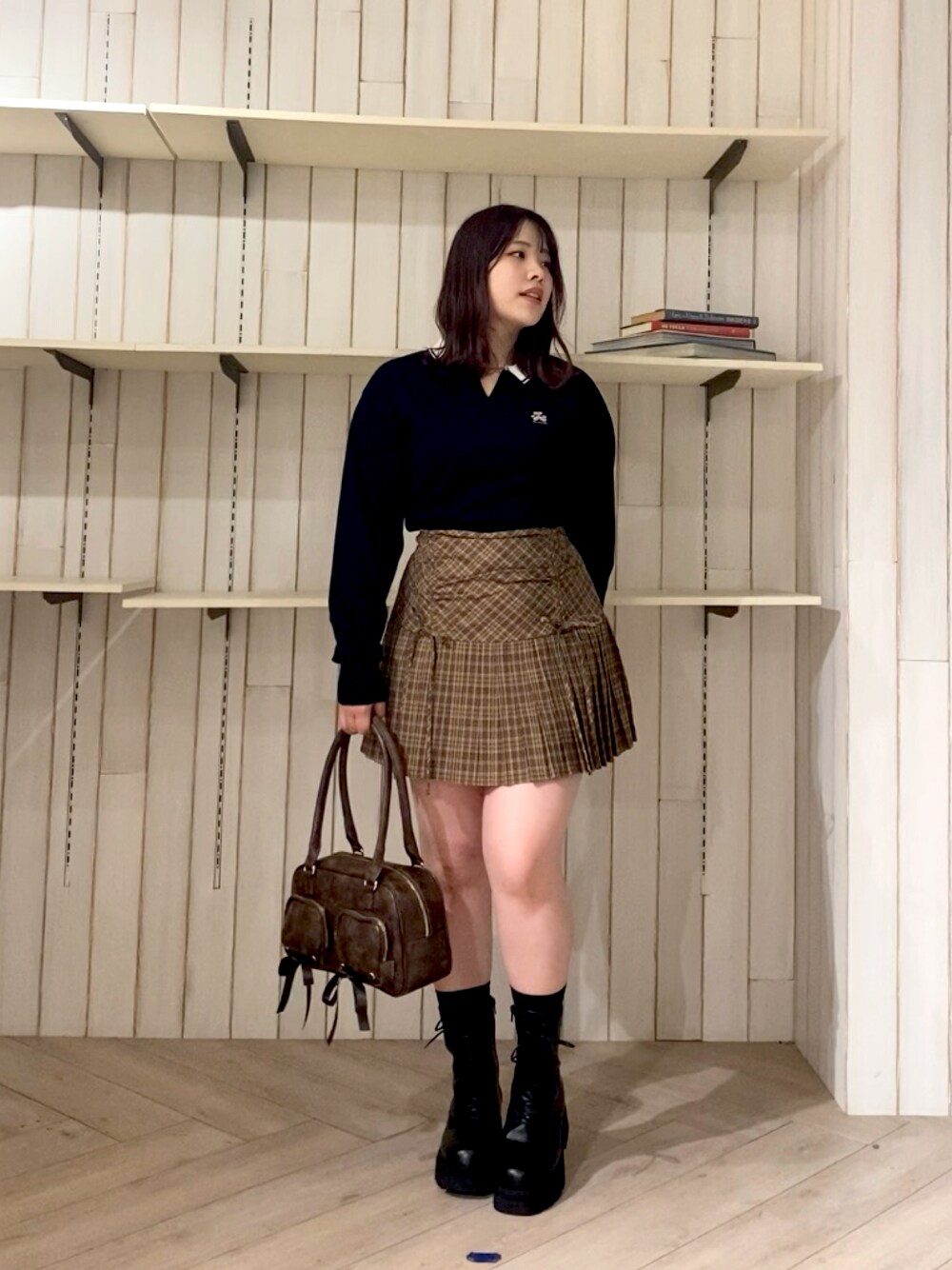 155cm,24cm,イエベ春,骨格ウェーブ ⭐︎トップス 二の腕パツパツな私でもゆるっと着れて。生地も柔らかく全くチクチクしないので快適に着れます◎ 胸元のクマが可愛い🐻♡ ⭐︎スカート 骨格ウェーブなのでプリーツは横張が強調される気がしてあまり得意ではないのですが、このスカートは細めのロープリーツなのであまりシルエットが広がらずに着やすかったです🥹 ドロストはお好きな位置まで動かせるし、インパン入ってるので安心♪ ⭐︎ブーツ 厚底+インヒールになっていて、爪先に向かって細くなってるデザインなので足が長くなった!って錯覚します😂私は普段24.5cmを履いていてLサイズがちょうど良かったです◎