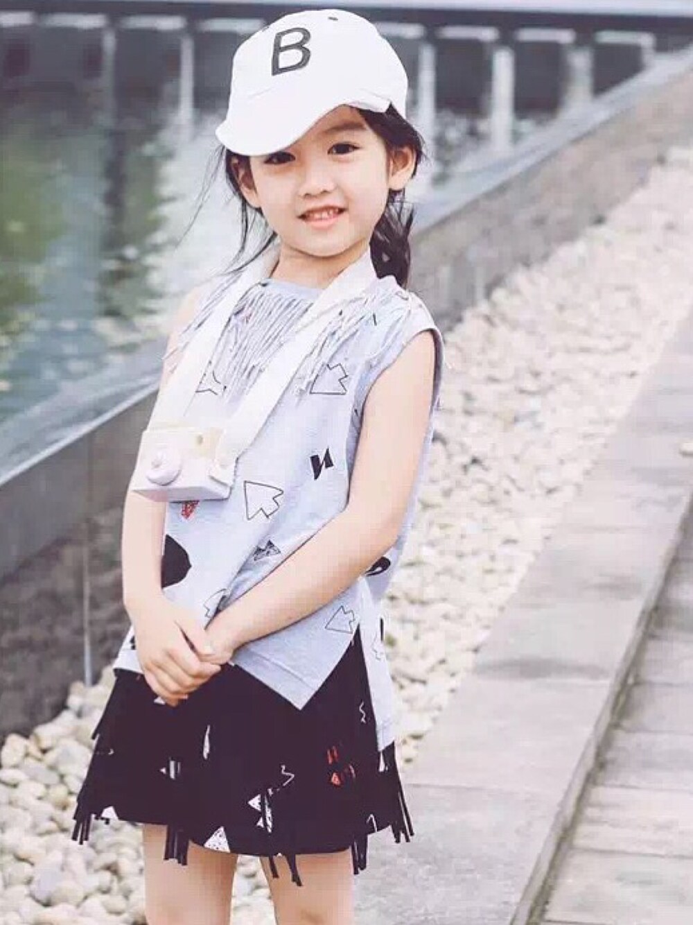 グレー系のシャツ/ブラウス、ブラック系のスカートを着用したキッズの夏コーディネートの1枚目の写真