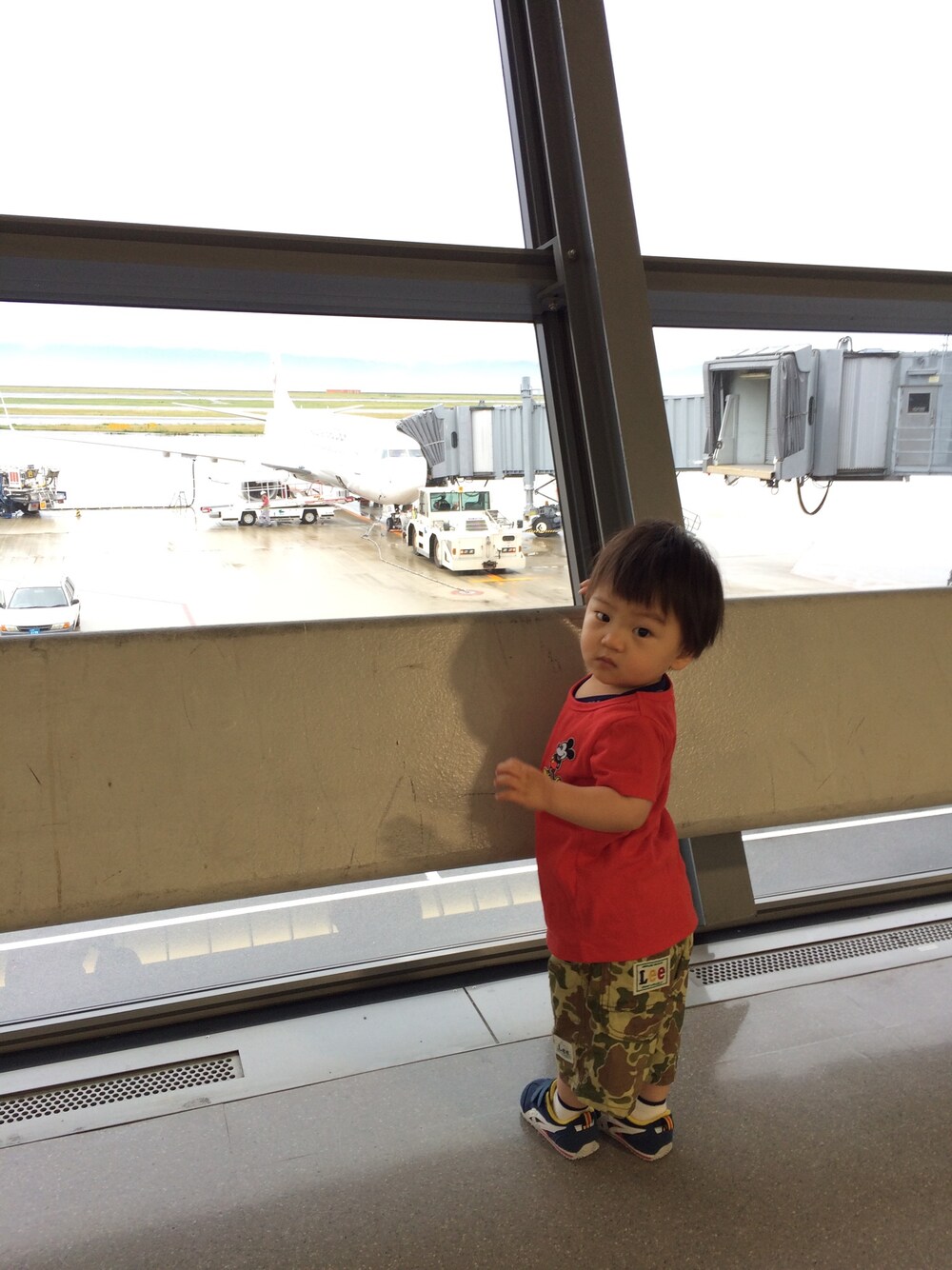 初めての飛行機。 息子はずっとヘッドフォンで音楽を聴いてノリノリでした。 KOEの真っ赤なTシャツにはミッキーのワッペンをつけました。