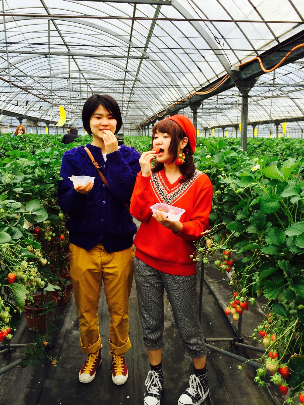友達とレトロコーデ✨ イチゴ狩り元取れたかな? たぶんとれたねw ピアスと靴下もイチゴです🍓