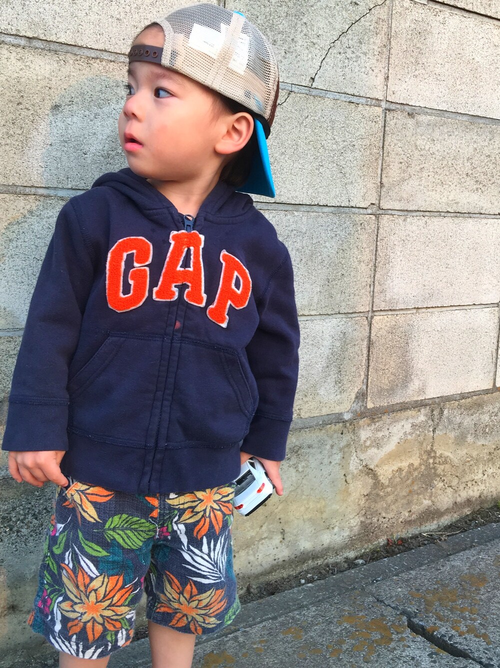 パンツの方がお気に入り☆ パンツが派手でゴチャゴチャしてるので、 上は無地かワンポイントで✌︎ たまたまあったgapのパーカーがネイビーだったのと、ロゴのオレンジがパンツの花と合っていたのでこちらをチョイス^ ^ 最後にキャップのターコイズブルーで全体の色バランスを調整してみました 初心者コーデですね^ ^