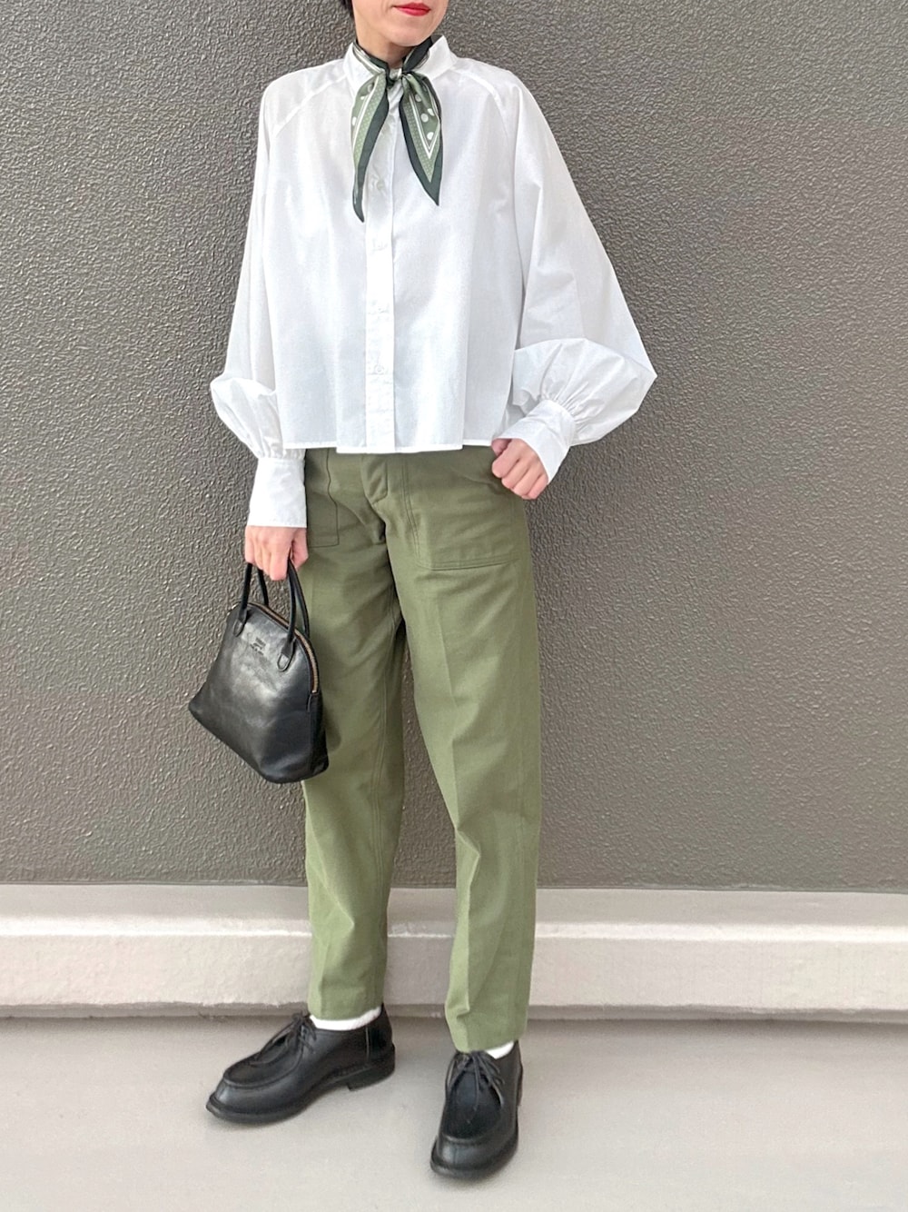 バルーンスリーブのやわらかいシルエットシャツ♡ ✖️グリーンパンツにスカーフをプラス🫶 やわらかい色合わせでまとめました。 見て下さりありがとうございました♡