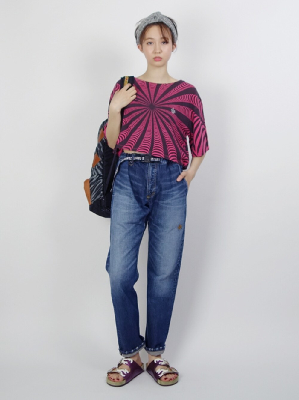 ショート丈トップスにオーバーサイズのデニムをハイウエストで履いた80'sなバランスのコーディネート。 モデルは寺原ナタリーさんです。
