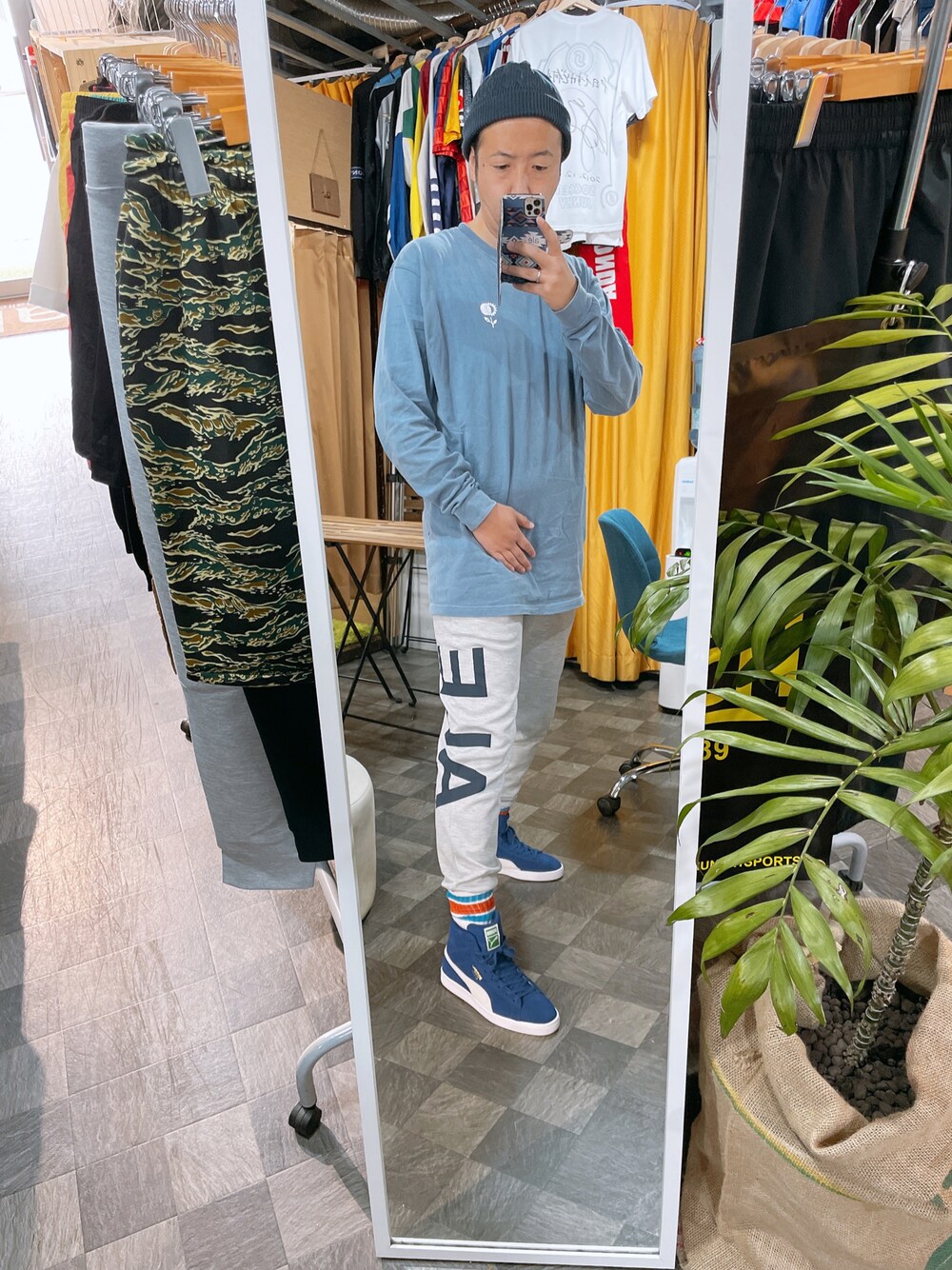横浜ブランドale くすみカラーのロンTにドライ素材のスリムスウェットパンツコーデ。 パンツにソックス被せればハイカットスニーカーとの相性抜群です。