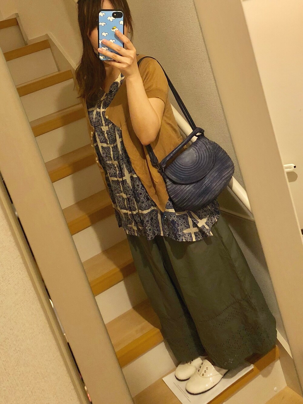 トップスとパンツがゆるっとしてるので、短めのボレロを羽織りカバンもコンパクトにしてみました。 間接照明の下で撮影すると画像編集が難しいですね🤔