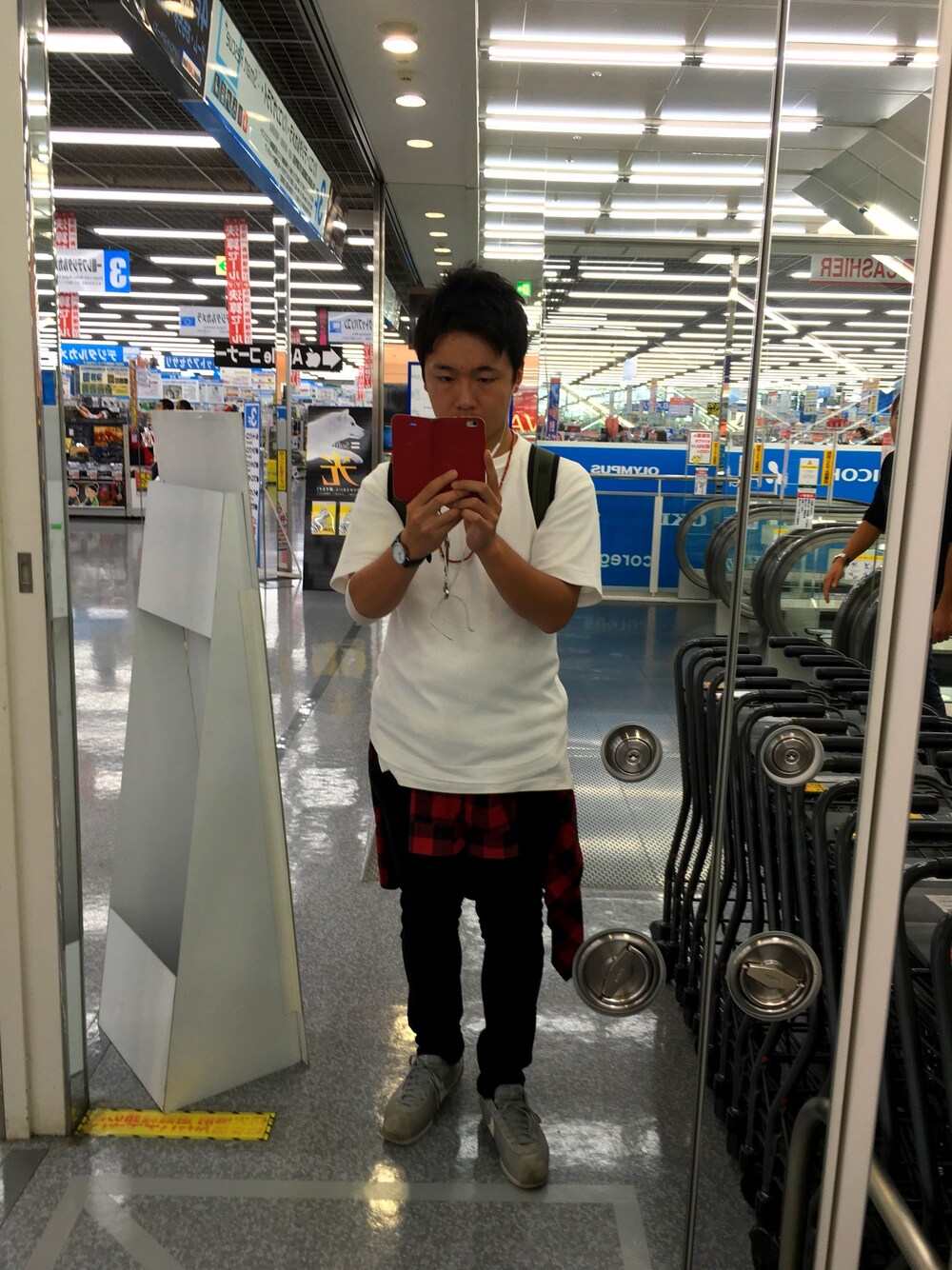 いつもはキレイめカジュアルなスタイルですが、今日はキレカジスタイルの中にアメカジ要素をプラス。トップスを白オン白でまとめてボトムを黒スキニーにしてまとまりを出してIラインを作りました。差し色として腰巻した赤のブロックチェックシャツとビーズネックレスを投入。シンプルコーデでも手抜きにならないキレイめアメカジスタイルを作ってみました!
