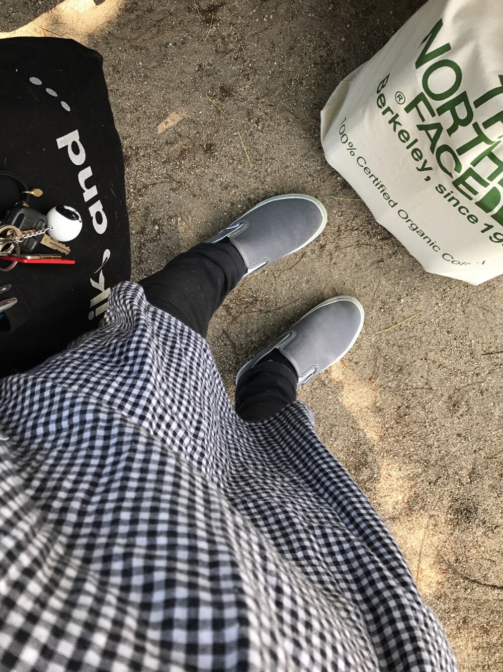 買い出しにてトート二つ持ち、疲れた足元失礼します。チョオパニのチェックワンピは裏地のチェック柄違いで可愛いんだ。楽チン動きやすさ重視だからワンピの下もパンツは吐く。露出は若い人に限るw