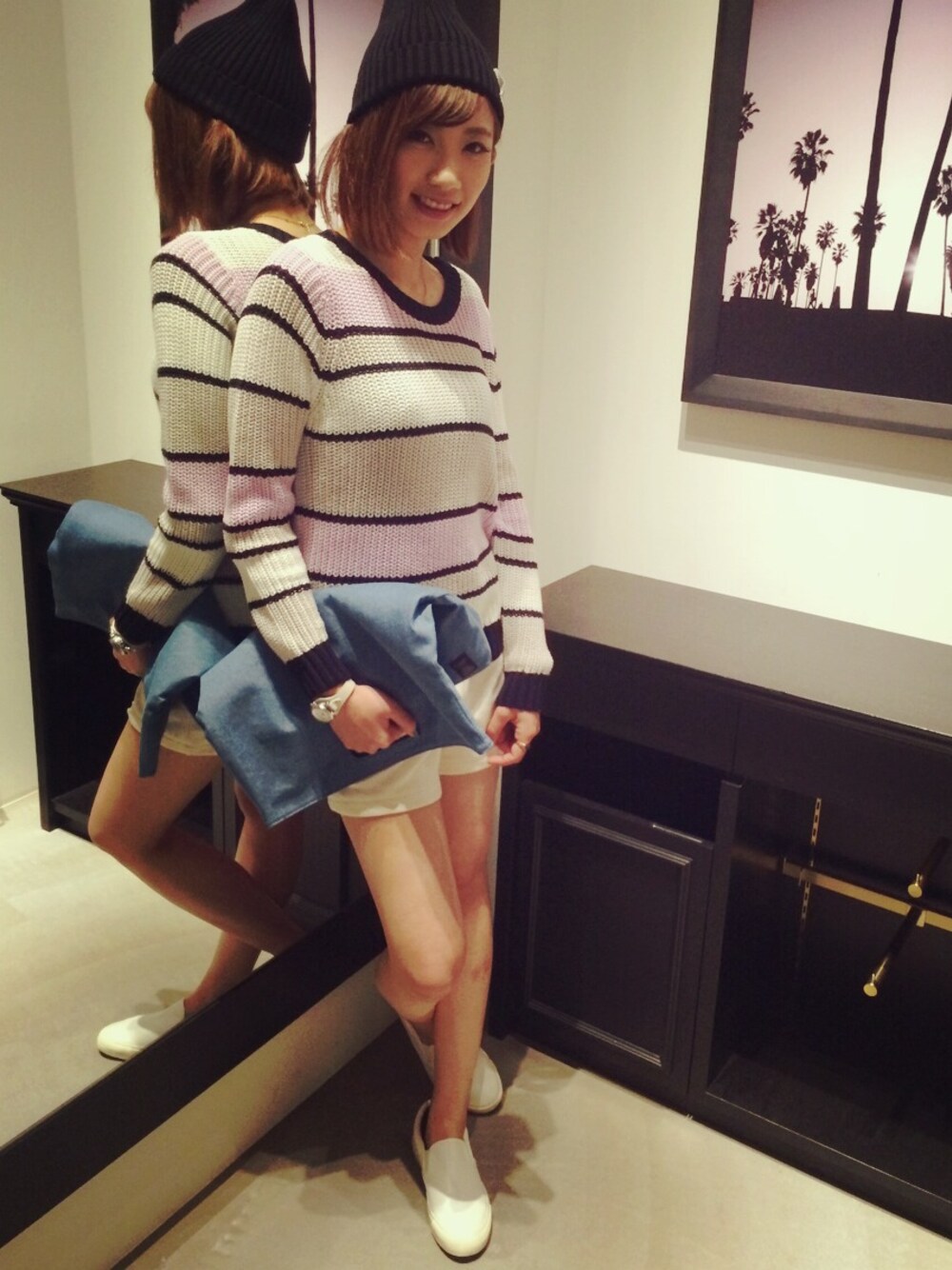 テーマはラフ!! 春らしいカラーのニットにスウェットのショートパンツを合わせました🙌 黒のニット帽で甘くなりすぎないように! メンズのデニムクラッチバッグで大人っぽく💓 絶妙なラフコーデにしてみました😆♪ 皆様も「ちょっとそこまで!」(笑) のお出かけには是非参考にしてみてください😉