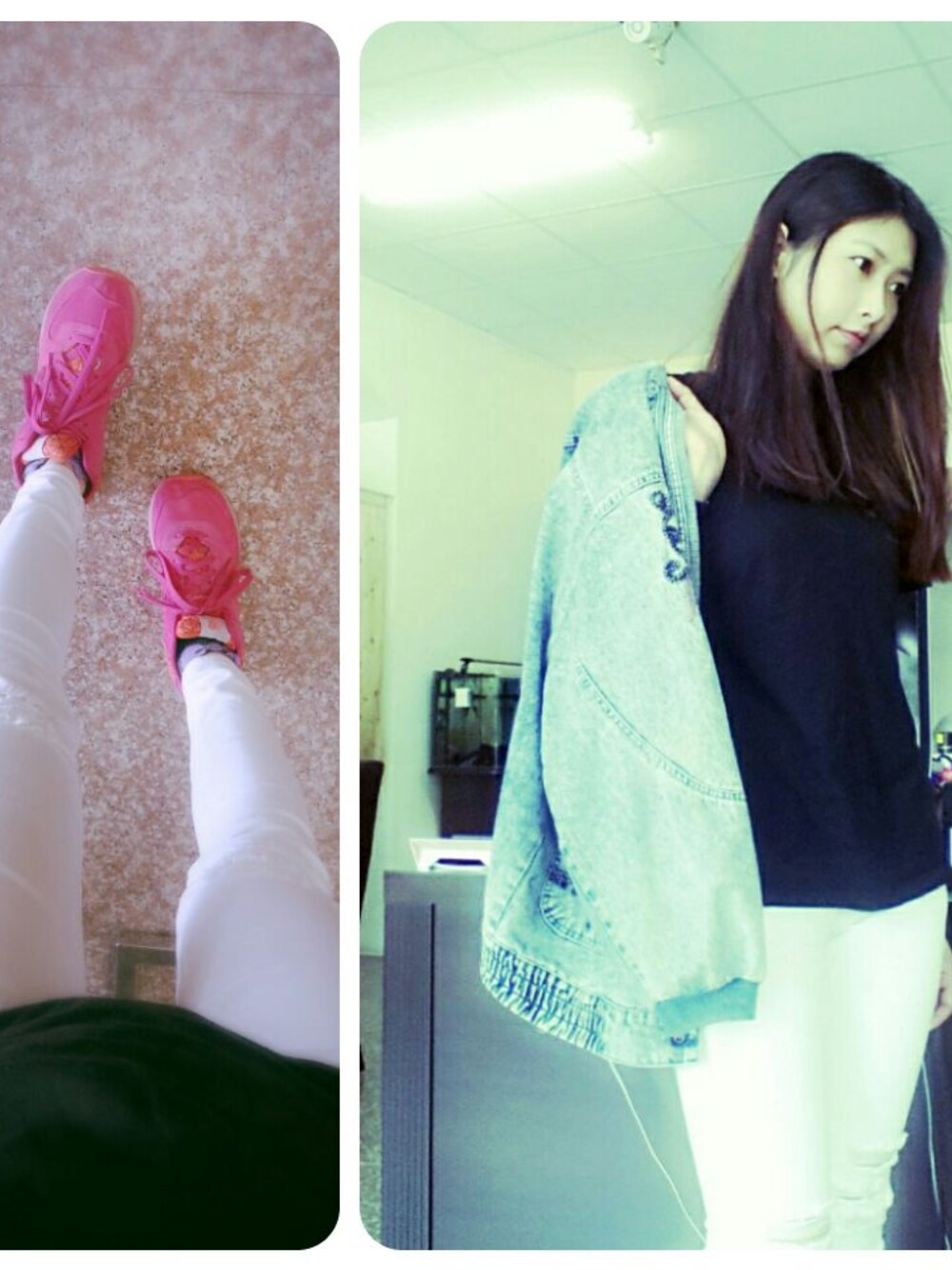 上衣:小V領素T 外套:古著花紋牛仔外套 褲子:白色刷破洞牛仔褲 手錶:CK