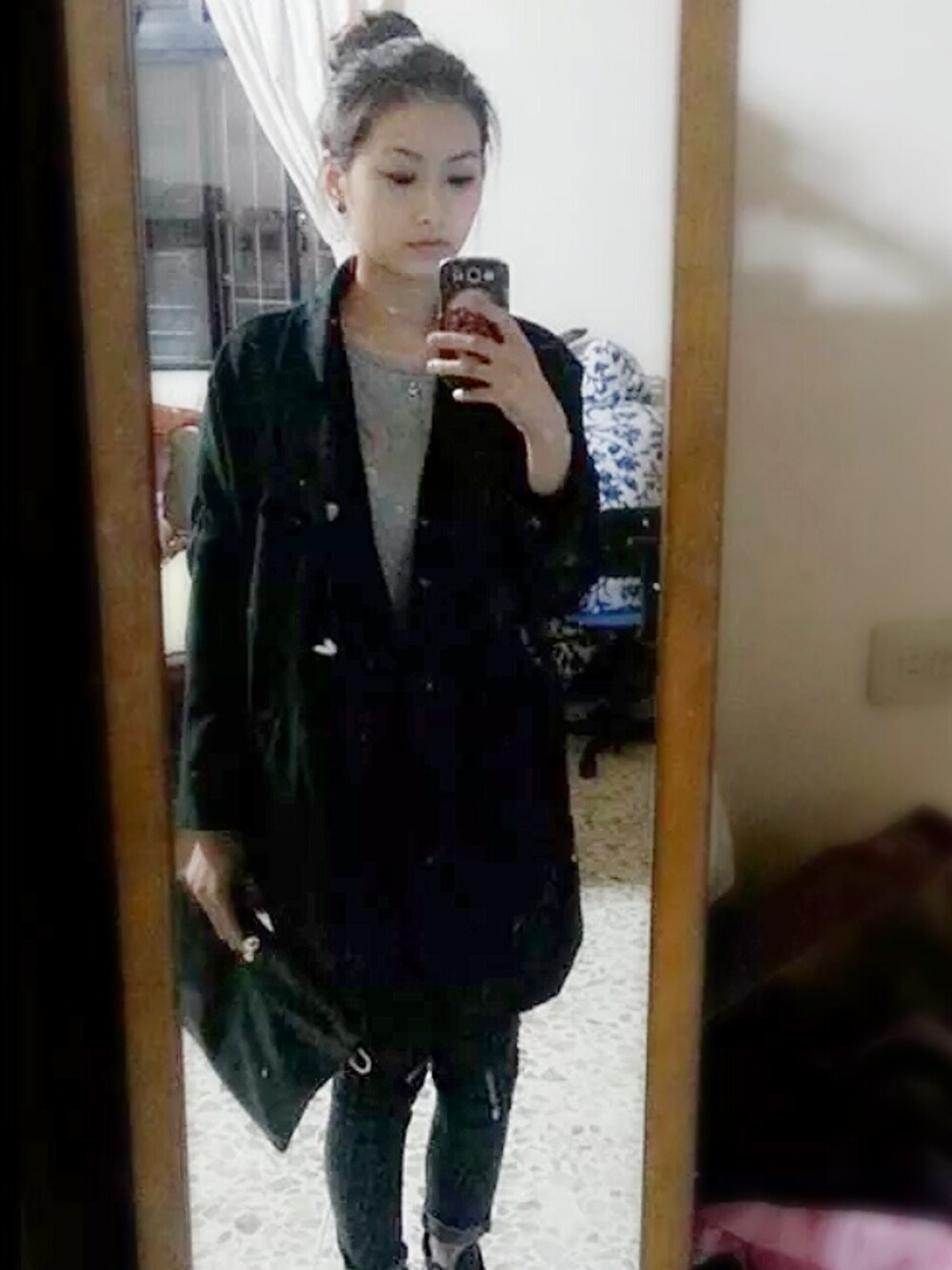 上衣:灰色T恤 外套:黑大風衣外套 褲:黑色牛仔褲