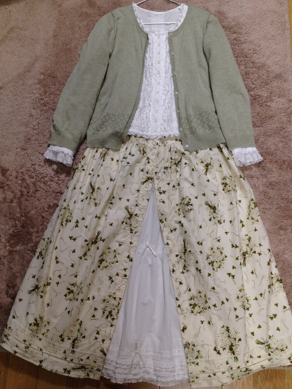 友達からもらったブラウスコーデ第三弾♡ ブラウスとペチコートとを同じコットンレースのものであわせてみました♪ スカートはクローバー&ひな菊のブーケのプリントなので、 ブランド違うけど、薄荷色のカーディガンで春っぽくしてみました。 *カーディガン SM2 *ブラウス PINK HOUSE *ロングスカート PINK HOUSE *ペチコート PINK HOUSE