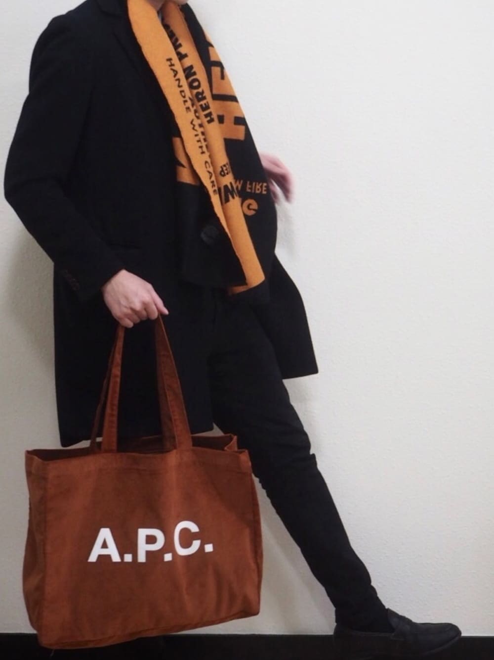 こんばんは! いつも沢山のいいねやお気に入りありがとうございます😊とても励みになって嬉しいです☺️ 今日は寒いのでHERON PRENSTONのマフラーとトートでみかんコーデです🍊