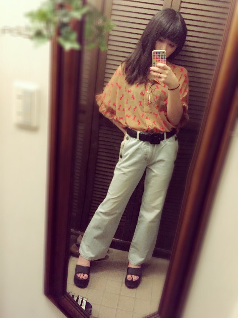 ブラック系のサンダルを着用したレディースの春コーディネートの1枚目の写真