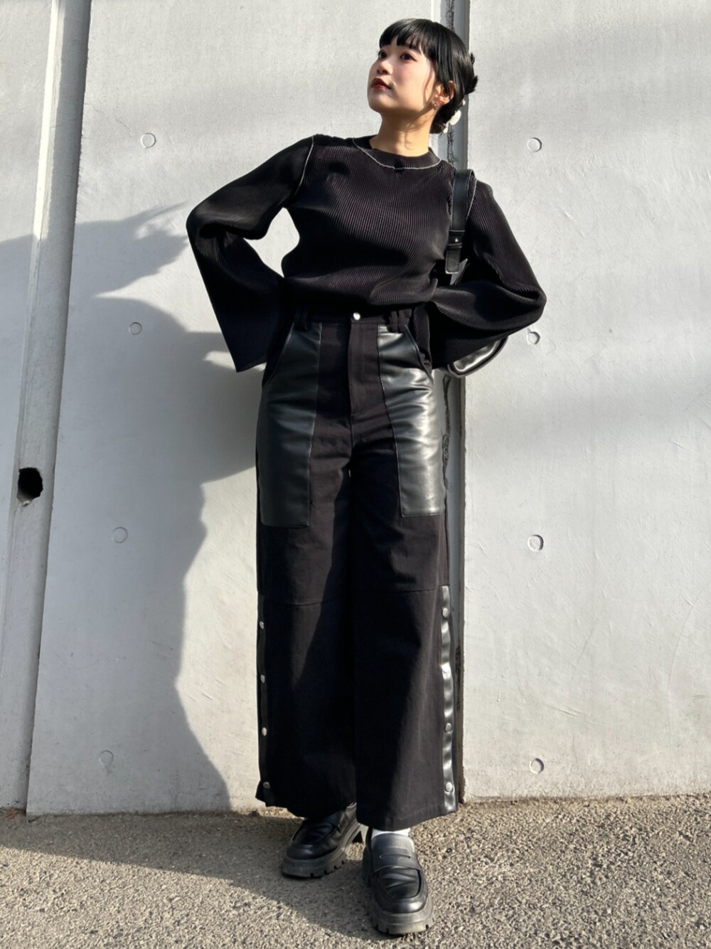 allm(Enewd nina)のその他パンツ「【ZOZO限定】レザー ミックス スナップ パンツ ワイド フェイクレザー」を使ったコーディネート